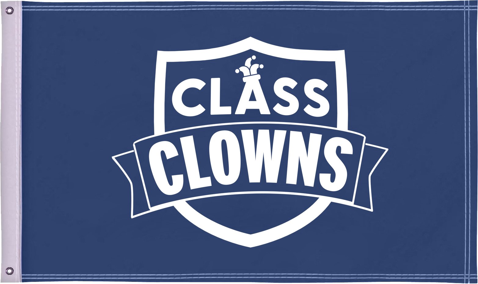 Featuring Class Clowns signature “blue” with Harvard/Oxford/Yale style typeface it screams “school flag” from across any playground