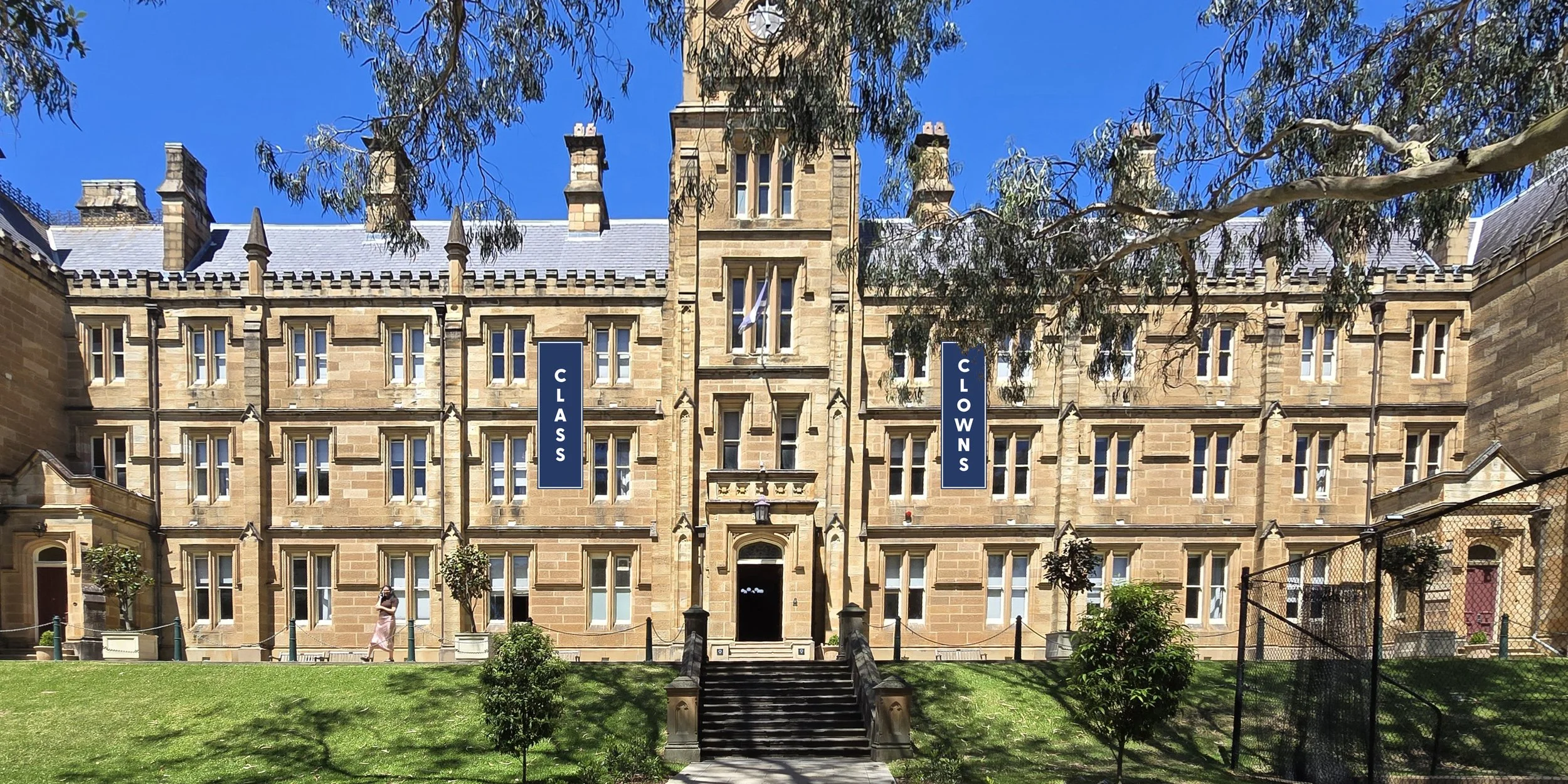 Class Clown Banner - White text in LOGO TYPEFACE on Navy Blue